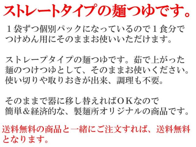 ストレートタイプの麺つゆです。1袋ずつ個別パックになっているので1食分でつけめん用にそのままお使いいただけます。ストレートタイプの麺つゆです。茹で上がった麺のつけつゆとして、そのままお使いください。使い切りや取りおきが出来、調理も不要。そのままで器に移し替えればOKなので簡単&経済的な、製麺所オリジナルの商品です。●注意事項・送料無料の商品と一緒にご購入いただければ送料無料となります。
