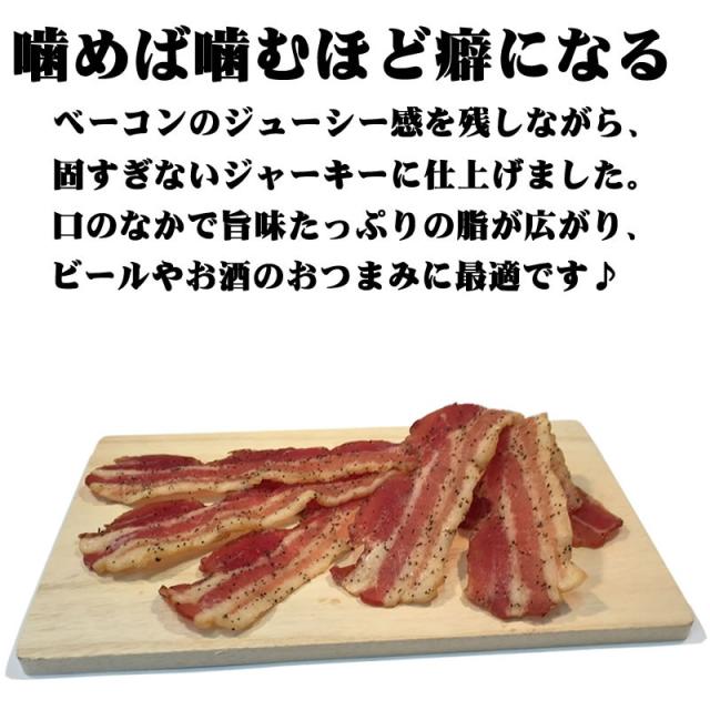 [送料無料][ベーコン][業務用][業務用][おつまみ][贅沢] 噛めば噛むほど癖になる。ベーコンのジューシー感を残しながら、固すぎないジャーキーに仕上げました。口の中で旨みたっぷりの脂が広がり、ビールやお酒のおつまみに最高です。ベーコンジャーキー 原材料:豚ばら肉、食塩、糖類(水あめ、砂糖)、乳たん白、香辛料、酵母エキス/リン酸塩(Na)、調味料(アミノ酸)、酸化防止剤(ビタミンC)、くん液、発色剤(亜硝酸Na)、着色料(ラック、クチナシ)、(一部に乳成分・豚肉を含む)