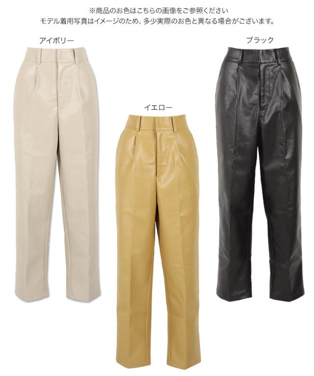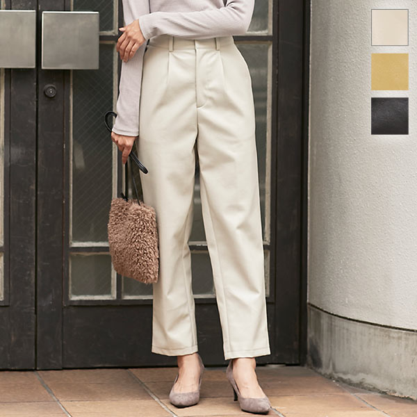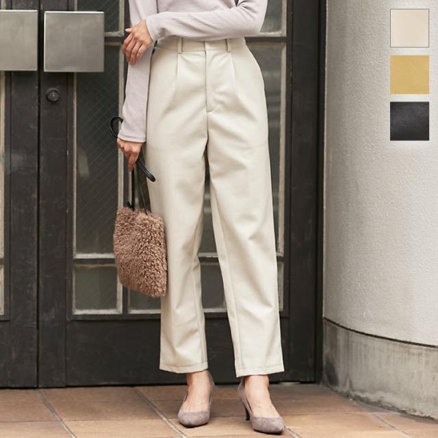 レザータッチフロントジップテーパードパンツ M3016 入荷済 タックパンツ レディース 体型カバー ボトムス ロング 大人 きれいめ 合皮 デイリー 白 黒 秋 カジュアル