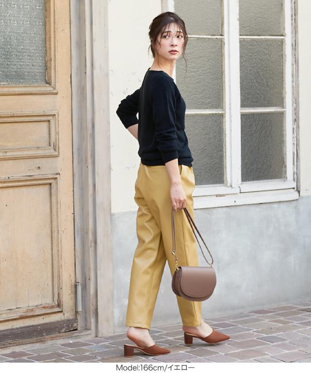 トレンドライクなレザータッチパンツのお目見え。裾にかけて細くなるテーパードシルエットで綺麗めコーデの外しアイテムにも◎。秋冬らしい素材感がシーズンムードが盛り上げます。【素材・サイズ感】光沢感がレザー見えする素材感、サスティナブルな一面もある一着です。動きを邪魔しない抜け感のある緩いシルエットが魅力のひとつ。コーデの主役になる存在感のあるひと品。※キャンセル/変更不可※お届けまでの日程について