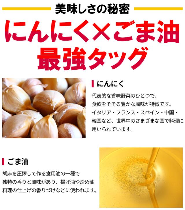 | 水あめ(国内製造)、植物油脂(ごま油、大豆油、菜種油)、おろしにんにく、たん白加水分解物、発酵調味料、食塩、香辛料/調味料(アミノ酸等)、酒精、酸味料、増粘剤(キサンタンガム)香辛料抽出物、(一部に小麦・大豆・ごまを含む) |