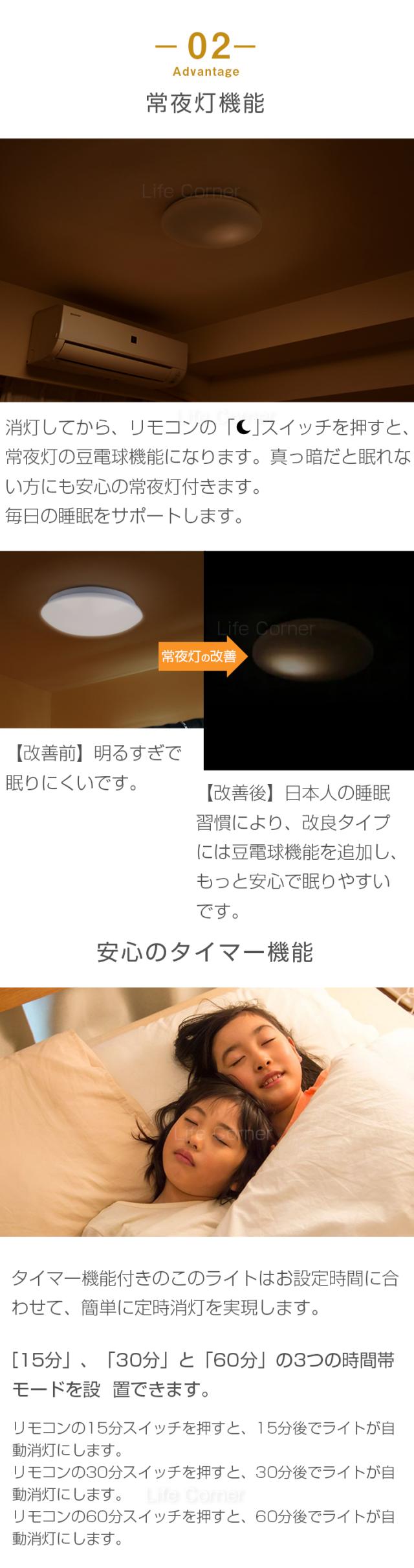 ※ 常夜灯の明るさは全灯の2%相当です。人によって明るさに感知が違いますので、明る過ぎるまたは暗すぎると感じされる場合もありますので、あらかじめご了承ください。