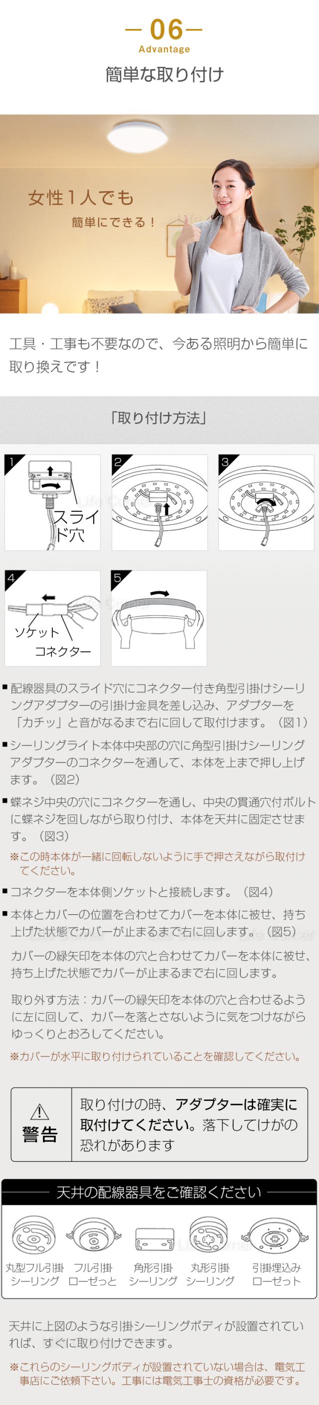 8.工事が不要で、今お使いのシーリングライトから取り付けアダプターなしで付け替えが簡単にできます。