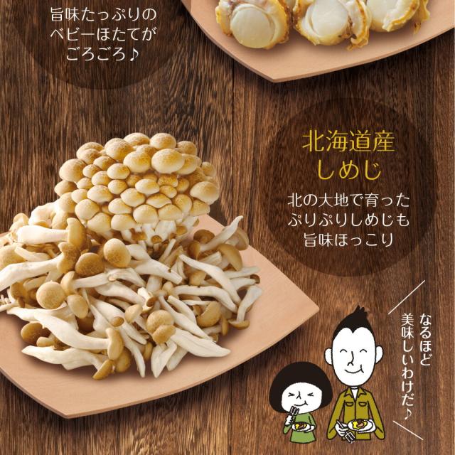 [具材]ボイル帆立貝(帆立貝(北海道産))、しめじ(北海道産)、[調味液]調味液(還元水飴、たん白加水分解物、オリーブオイル、食塩、米酢、チキンエキス調味料、ターメリック、オニオンパウダー、ローストベジタブル調味料、酵母エキス、白胡椒)(国内製造)/調味料(アミノ酸等)、香辛料抽出物、増粘多糖類、香料、(一部に小麦・乳成分・ごま・ゼラチン・大豆・鶏肉・豚肉を含む)