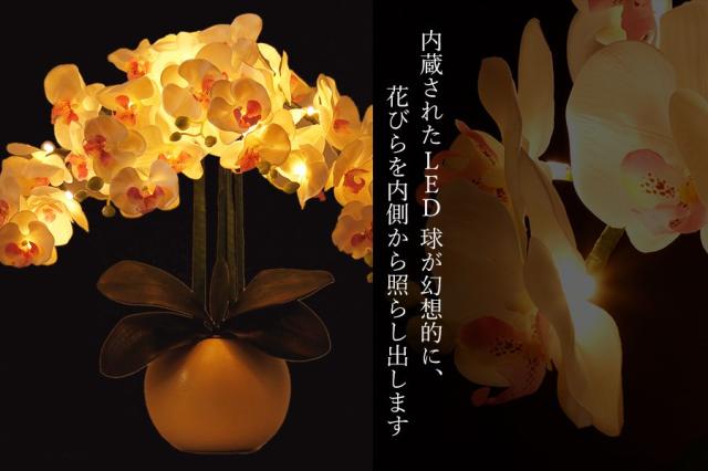 22個も内蔵されたLED球が幻想的に、花びらを内側から照らし出します。明りを灯さなくても美しい、華やかなインテリア装飾花としても最適。