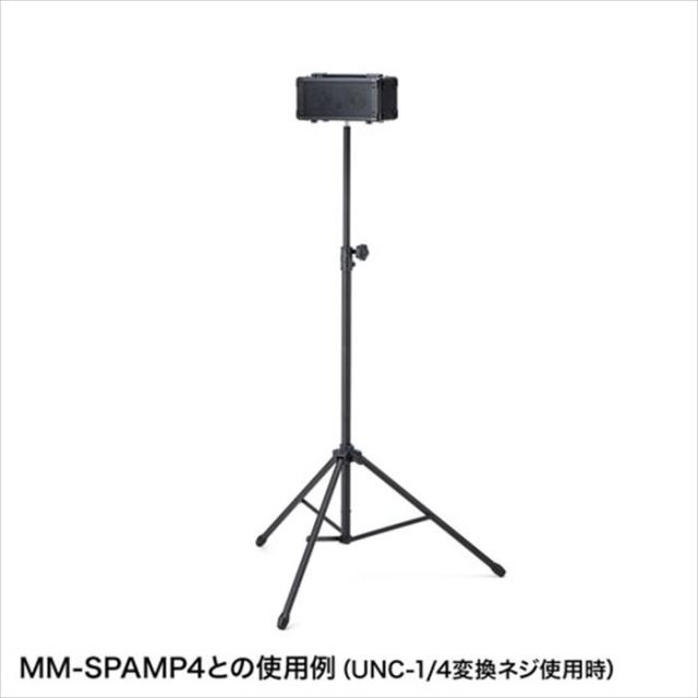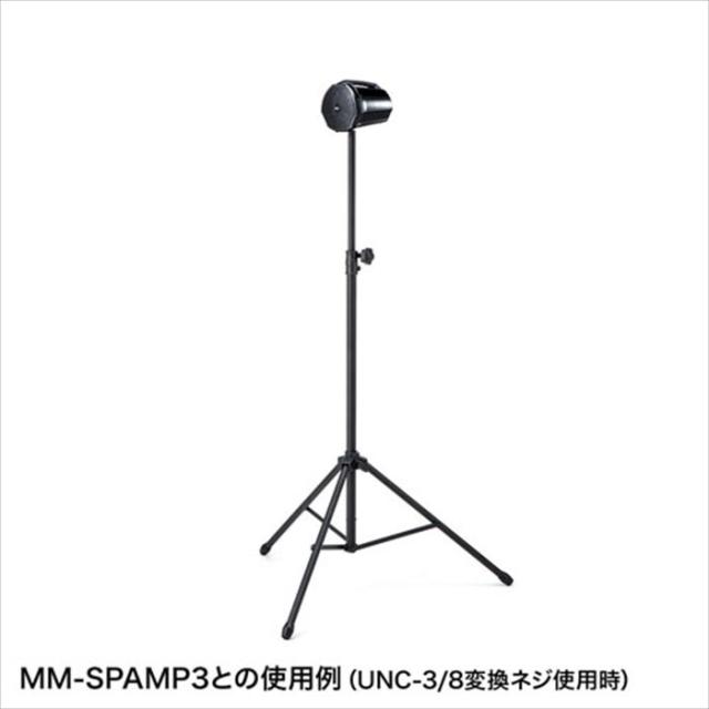 UNC3/8ネジを持つスピーカースタンドです。サンワサプライ製拡声器スピーカー(MM-SPAMP3)に対応しています。付属の変換ネジ(UNC3/8→UNC1/4)を使用することでサンワサプライ製拡声器スピーカー(MM-SPAMP10、MM-SPAMP4、MM-SPAMP7、MM-SPAMPBT、MM-SPAMP)にも対応いたします。