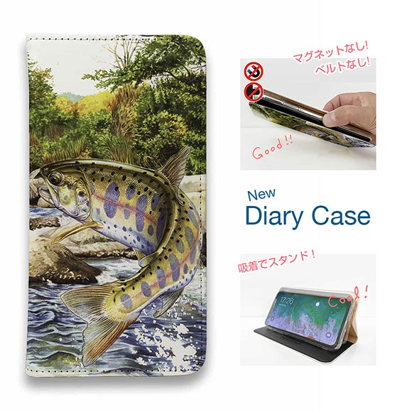 スマホケース 手帳型 ベルトなし iPhone17 Pro Max iPhone Air iPhone16e Pro Max 16 Plus 15 Pro Max 14 Plus Xperia 10 VII Galaxy AQUOS Pixel10 Pro XL 釣り 魚 ルアー 八百板浩司 メイフライにかかったヤマメ