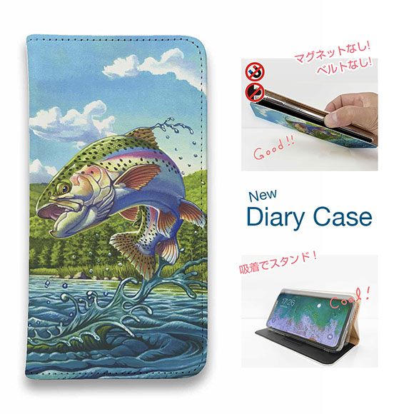 スマホケース 手帳型 ベルトなし iPhone17 Pro Max iPhone Air iPhone16e Pro Max 16 Plus 15 Pro Max 14 Plus Xperia 10 VII Galaxy AQUOS Pixel10 Pro XL 釣り 魚 ルアー 八百板浩司 Leaping Rainbow レインボートラウト