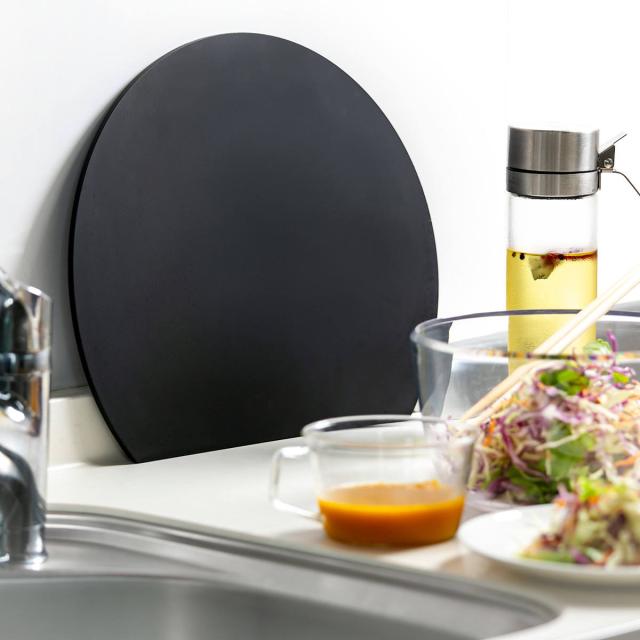 直線の面があるので壁に立て掛けて収納できます。厚さ約5mmの薄型設計で、キッチンの限られた作業スペースでも邪魔になりません。