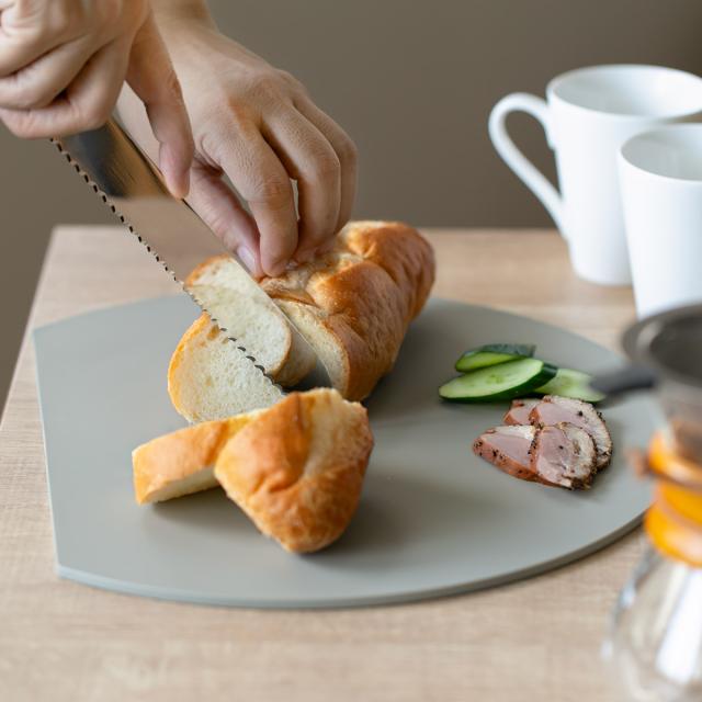 調理台を有効活用できるかまぼこ型のまな板です。奥行きがあって広く使える丸型と、手前でスムーズに食材が切れる角型の良い所を採用しました。切った食材を移動させながら効率良く作業ができ、切った食材をまな板の上に置いたまま他の食材をカットすることもできます。
