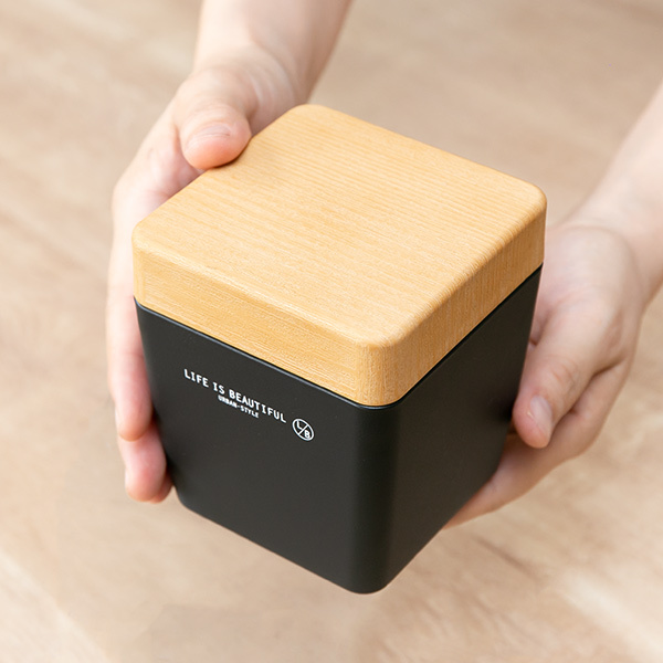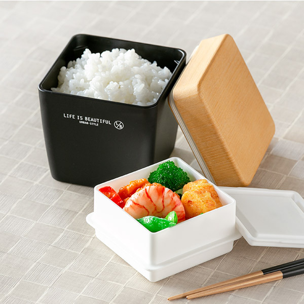 「LIFE IS BEAUTIFUL」のロゴがおしゃれな正方形の弁当箱です。木目調の蓋と黒を基調としたカラーリングで男性も持ちやすいです。内容器付きでご飯とおかずを分けて入れることができます。中容器にはシール蓋、蓋にはシリコンパッキンが付いているので汁漏れしにくく持ち運びが安心です。