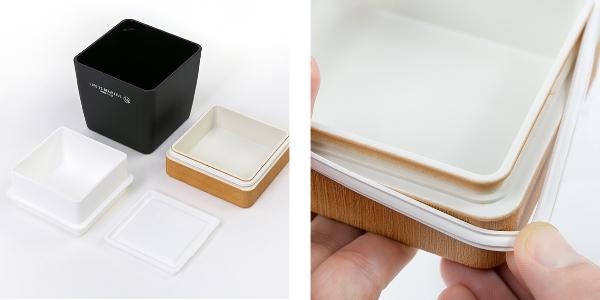 | 材質 | 本体:ポリエチレンテレフタレート、ABS樹脂 蓋:ABS樹脂 上段:ポリプロピレン シール蓋:ポリエチレン |