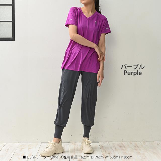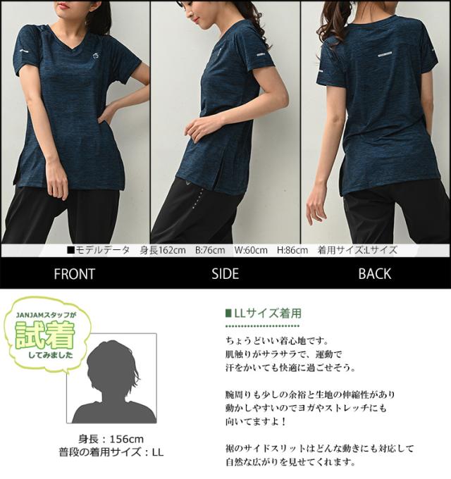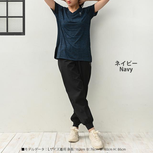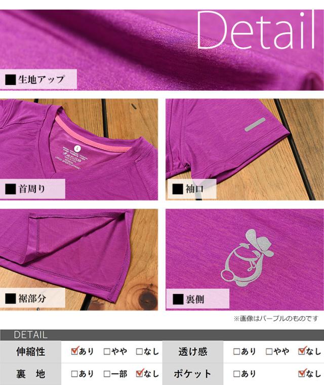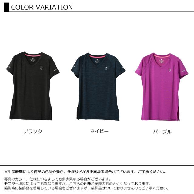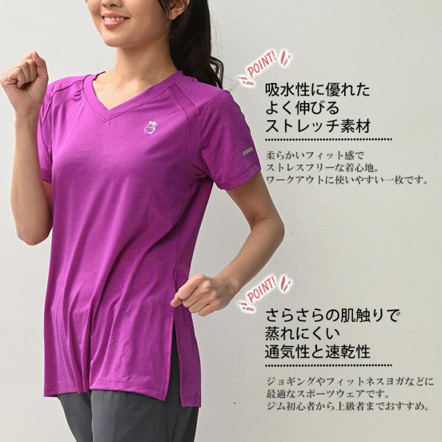 胸元ワンポイントがキュート! Vネックですっきりと着こなせる半袖カットソー。 吸水性に優れた良く伸びるストレッチ素材で さらさらと快適に着られます。 ジョギングやフィットネス ヨガなどに最適なスポーツウェアです。 |
