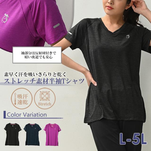 大きいサイズ レディース 半袖トップス カットソー 半袖Tシャツ ワンポイントプリント Vネック サイドスリット トップス スポーツウェア ジムウェア フィットネス ランニングウェア おうちヨガ 接触冷感 吸汗速乾 ストレッチ生地 伸縮 よく伸びる さらさら生地 おしゃれ かわいい 大人 女性用 運動着 運動会 体育大会 体育祭 夏用 夏服 30代 40代 50代 春 夏 秋 冬 黒 紺 紫 L LL 3L 4L 5L 13号 15号 17号 19号 sp-all-tp0116 トレーニングウェア