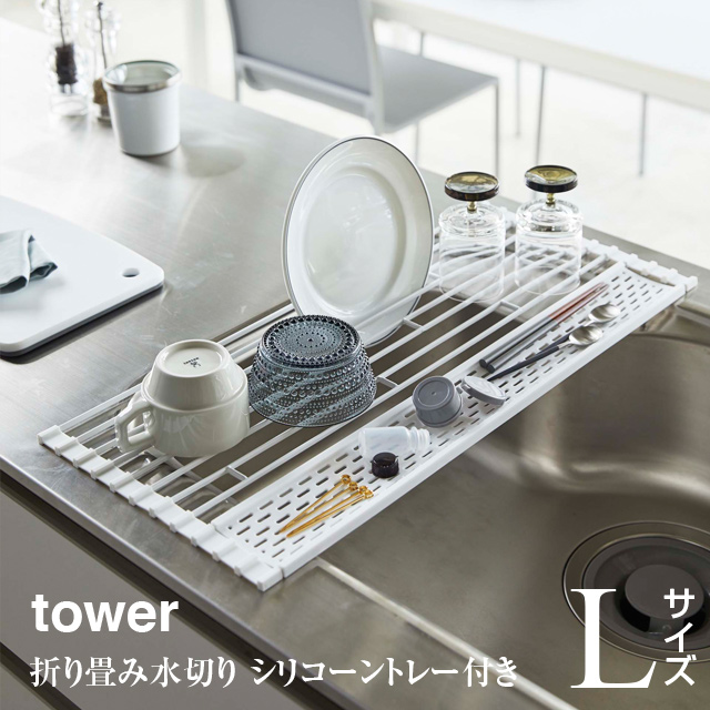 【取り寄せ発送】【tower】折り畳み 水切り タワー シリコーントレー付き L 5055\ 対象同梱で送料込み /【山崎実業 送料無料 シンク カゴ 便利 収納 スタイリッシュ キッチン】