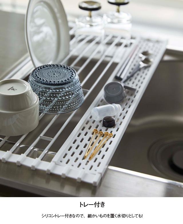 小物が置けるシリコーントレー付き! シリコーントレー付きなので、小さな物も水切りできます。 使わない時はくるくる丸めてコンパクトに収納できます。