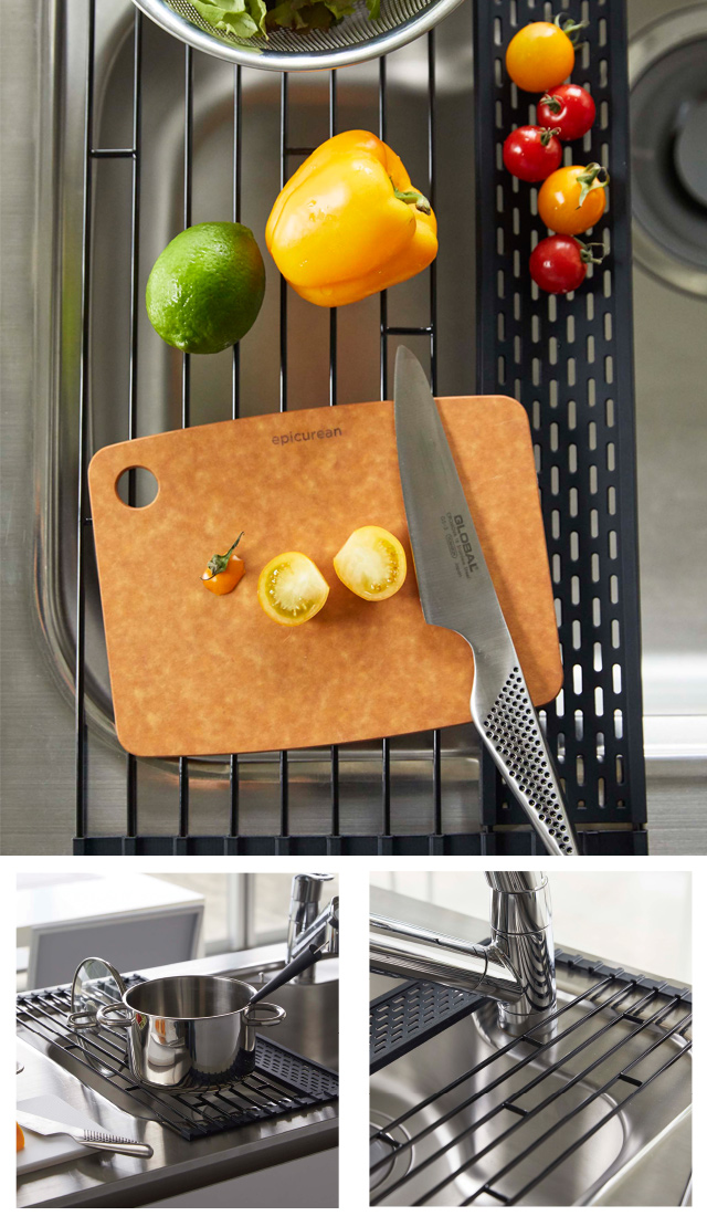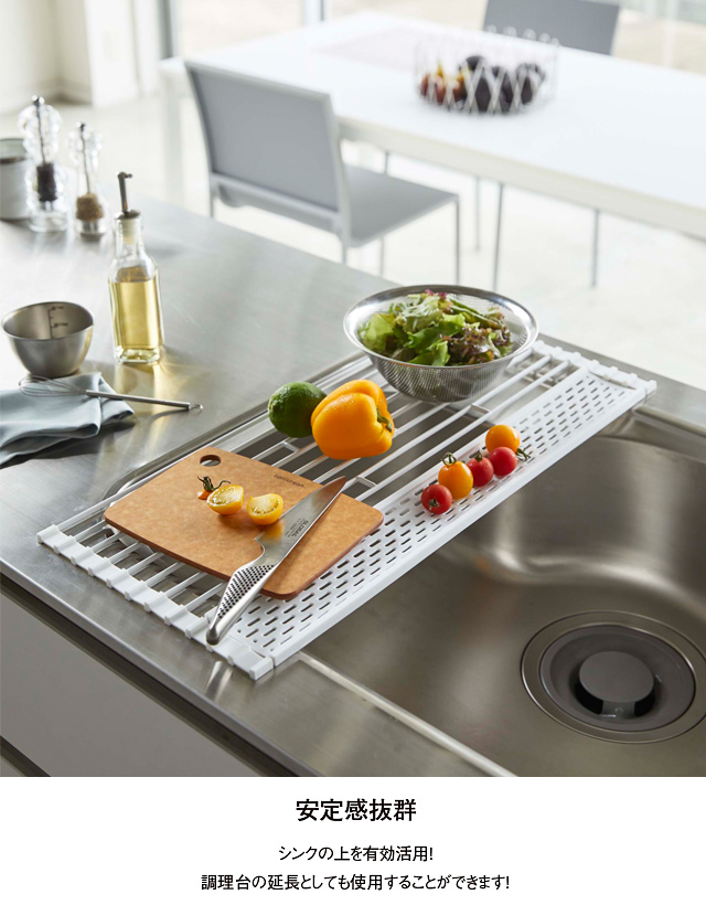 シンクのスペースを有効活用! 調理台延長として使用することもできます。 置くものに合わせて折り畳めば、省スペースに使用できます。 鍋の一時置き場所として。