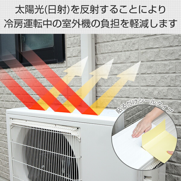 | 商品説明 | ●エアコン室外機の天面に貼るだけで太陽光(日射)を反射することにより、冷房運転中の室外機の負担を軽くすることができます ●貼るだけで室外機の表面温度を約24度マイナス ●エアコンの冷却効果を上げることができます ●シールタイプなので簡単に貼り付けすることができ、見た目もスッキリで目立ちません ●4枚入りで、貼り付ける天面のサイズに合わせてハサミでカットすることができます 縦32×横20cm×4枚入り ●耐熱温度:80度 ●雨や熱に強い高耐候 ●室外機全体を覆わないので見た目がすっきり |