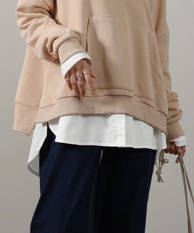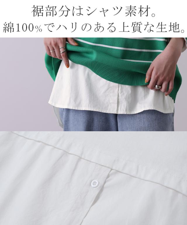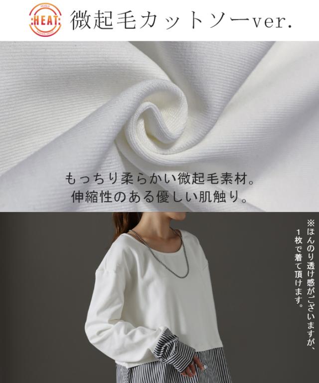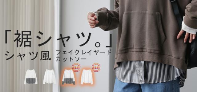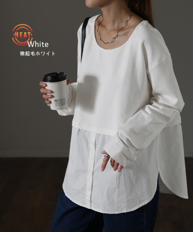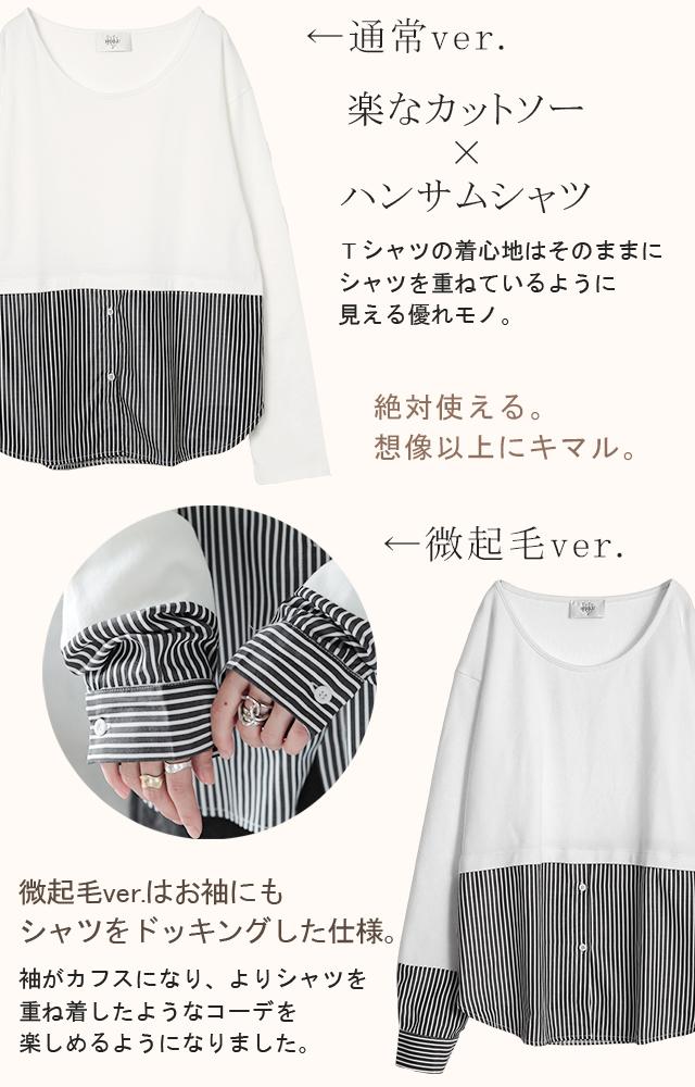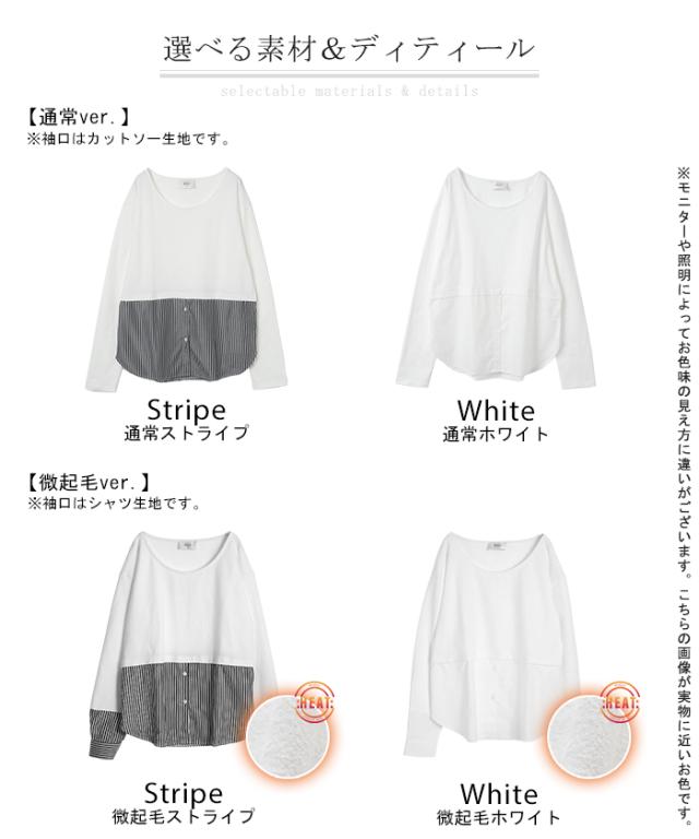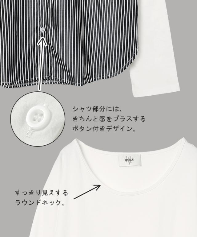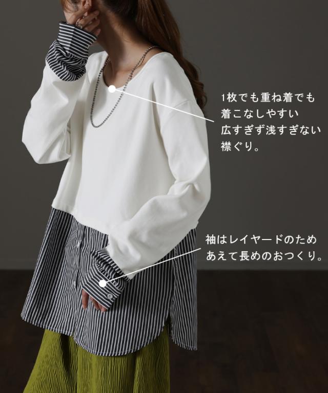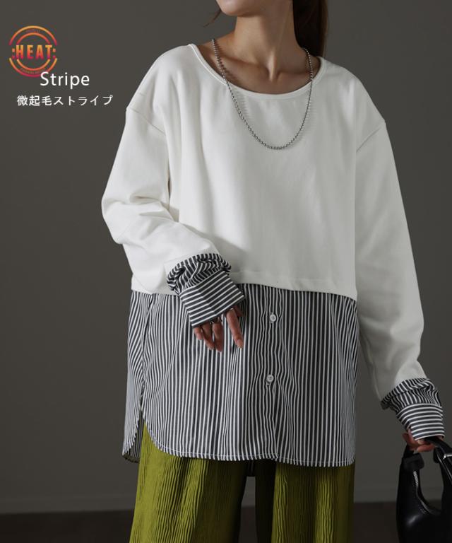 シャツ × カットソー レイヤード 風 フェイク シャツ トップス 裏起毛 レイヤードシャツ レディース シャツ フェイク インナー 付け裾 長袖 ロンT ロングTシャツ 重ね着 スリット ストライプ 白 ホワイト つけ裾 綿 大きいサイズ 丸首 冬 秋 HUG.U 秋新作