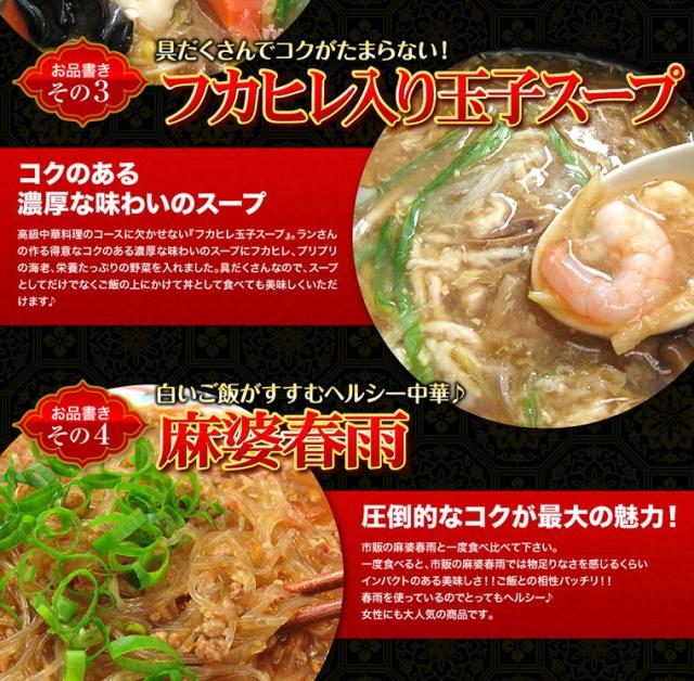 フカヒレ、竹の子、玉子、椎茸、エビ、葱、白菜、鶏肉、ゴマ油、鶏ガラスープ、塩、胡椒、調味料(アミノ酸等)、醤油(大豆、小麦を含む)、澱粉、植物油