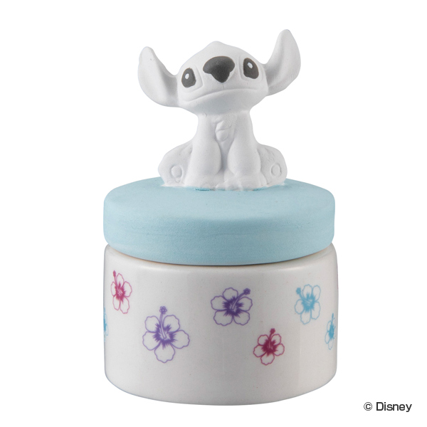 スティッチのかわいいアロマポットです。ポットにお好みのアロマ液やアロマオイルを入れフタをします。フタ部分が少しずつアロマを吸い上げ香りが広がります。玄関や洗面所、リビングなど火や電気を使用しないので好きな場所に置いて香りを楽しめます。