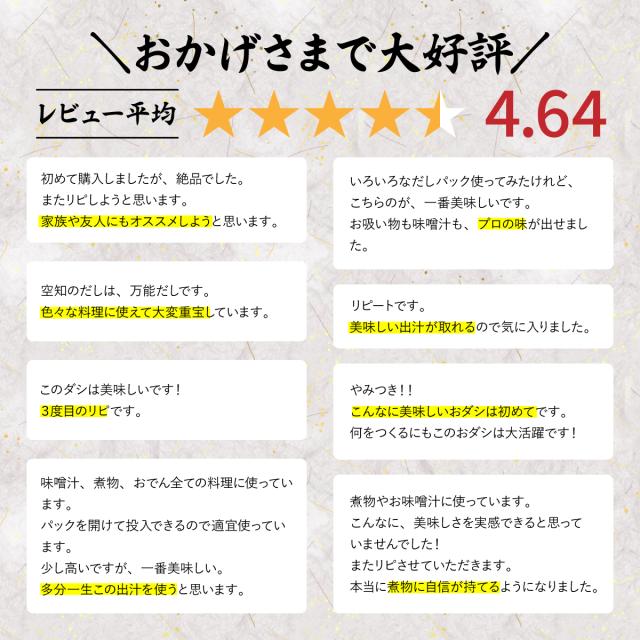 | ホタテと真昆布に、相性の良い北海道羅臼産の海塩を合わせ、かつお節とうるめいわしを加えました。 とれたて素材を素早く加工し、滋味豊かな万能だしです。 ※開封後は湿気を避けるため、チャックをして保存し、お早めにご使用ください。 【使用方法】 ◆うどん・そばのつゆに 400mlの水に1袋を入れ、沸騰後1〜2分間煮出してから取り出し、お好みで醤油やみりんで味を調えてください。 ◆煮物のだしとして 3〜4人前の材料に対して2袋を入れ、沸騰後1〜2分間煮出してから取り出し、お好みで醤油やみりんで味を調えてください。 ◆焼き飯のかくし味に 焼き飯2〜3人前に1袋を入れて(袋を破り、中身のみをご使用ください。)いっしょに炒め、最後に塩・こしょう等で味を調えてください。 ◆北海道産の帆立(ほたて)が入っていて旨味があります。北海道のお土産として人気上昇中! |