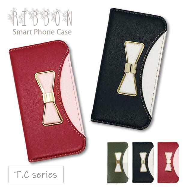 Android One X5 LG アンドロイドワンX5 手帳型 ケース ベルトなし レザー リボン デコ ゴールド バイカラー ツートン レター型 サフィアーノ調 おしゃれ かわいい スマホ カバー T.C