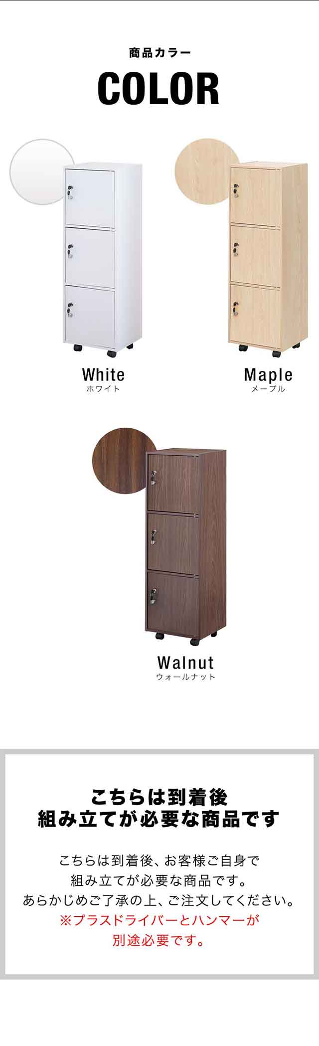 | 特記事項: こちらはお客様による組み立てが必要な商品です。 ※組み立てにはドライバーとハンマーが必要になります。別途ご用意ください。 ※転倒のおそれがあるため、上に2個以上連結して使用しないでください。 |