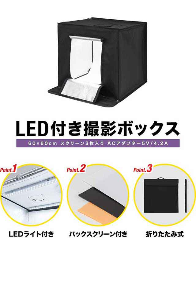 撮影キット 撮影ブース 撮影ボックス 60x60cm LEDライト付き 背景布 3枚付き 折りたたみ 撮影 写真 スタジオ ブース ボックス 撮影スタジオ 撮影用 スタジオボックス オークション 商品撮影 物撮り 写真撮影 BOX 背景 スクリ-ン 照明付 送料無料