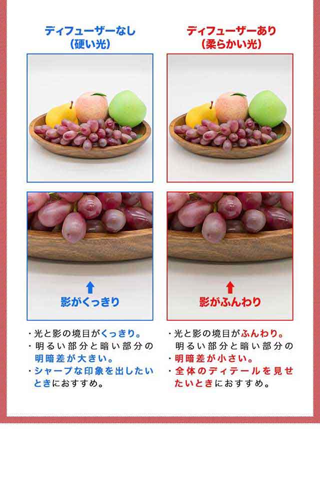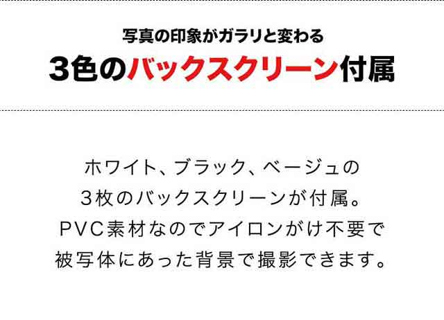 | セット内容: 本体 バックスクリーン×3枚(ホワイト、ブラック、ベージュ) ディフューザー LEDライト×2本 ACアダプター |