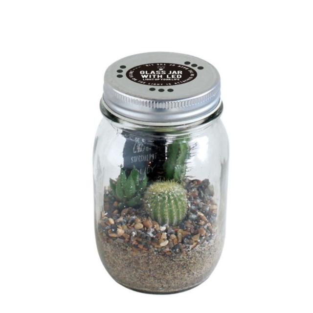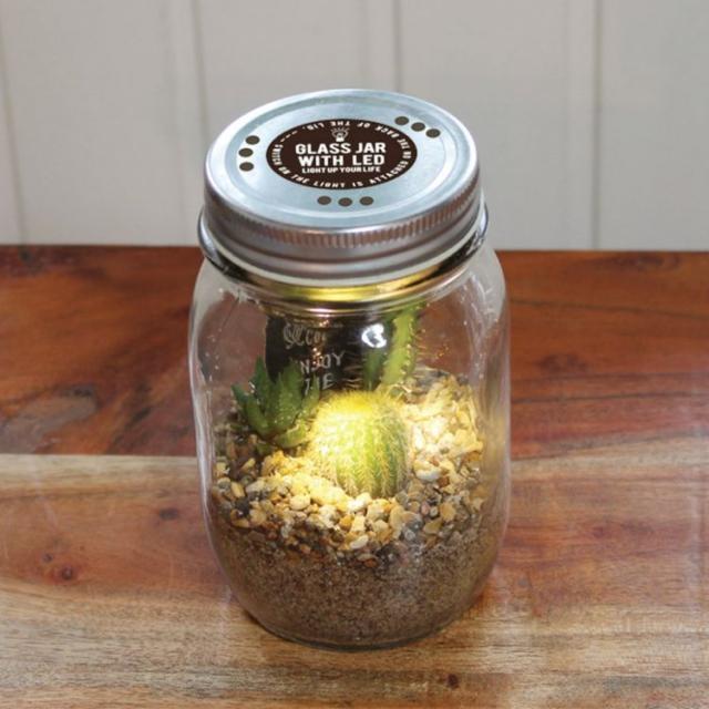 日々の中で見過ごしてしまっている小さな物事にスポットライトをあてようフタの裏に付いているスポットライトがジャーの中のサボテンたちを照らします。