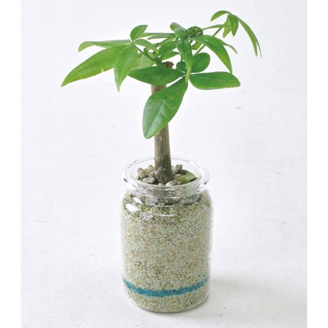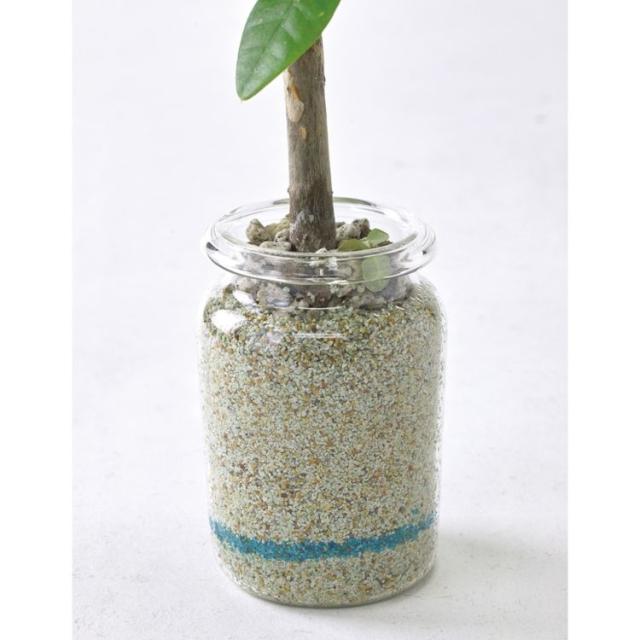 カラーサンドとハイドロボールで地層のようにデザインされた模様を活かし、透明ガラスの器に植え込みました。