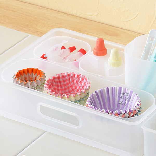 こまごまする小物用品や趣味道具を細かく分けて収納出来ます。例えば、お弁当に入れる小分けカップなど、普段使うからこそ引き出しに入れると使いにくくなってしまいますよね。そんなときにこの小物入れケースが役に立ちます。シンプルなデザインと丁度いいサイズ感がスッキリとした印象を与えます。