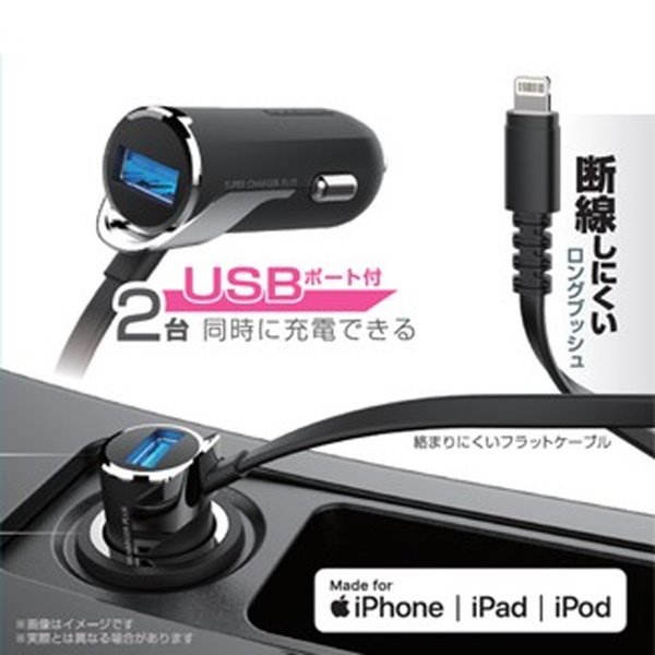 ●車のDCソケット電源からUSBポート+Lightningコネクタで2台同時に充電できるDC充電器。