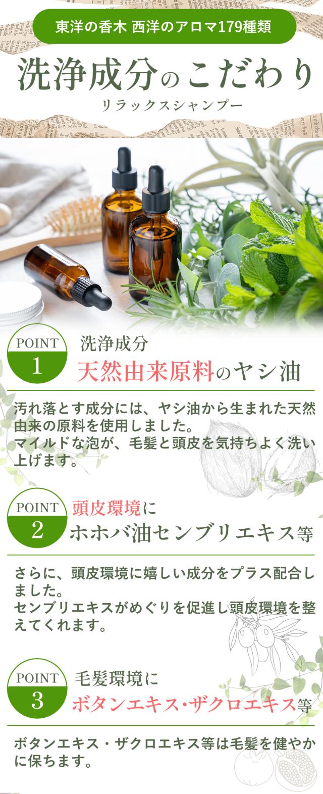 更に毛髪・頭皮をすこやかに保つ、ボタンエキス、ザクロエキス、毛髪にコシを与えるセンブリエキス、頭皮の潤いを保つホホバ油などが入っています。