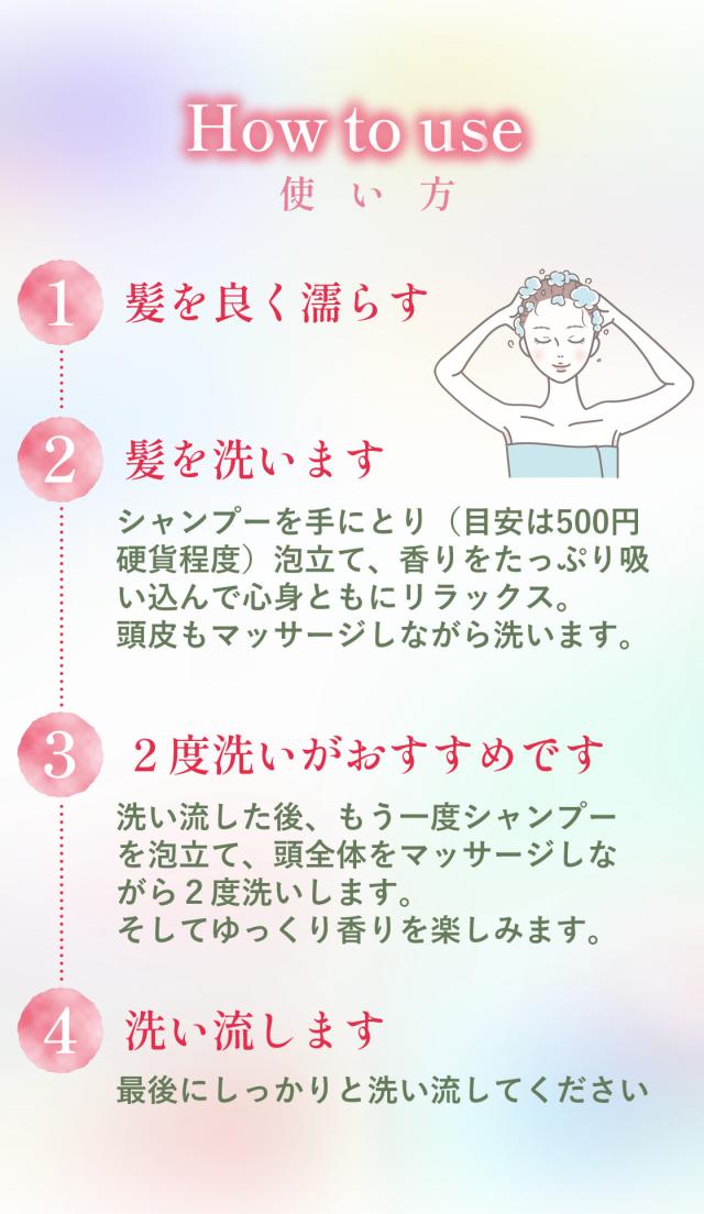 【3】軽く洗い流した後、もう一度シャンプーを泡立てて頭全体をマッサージしながら2度洗いします。香りをゆっくりお楽しみください。