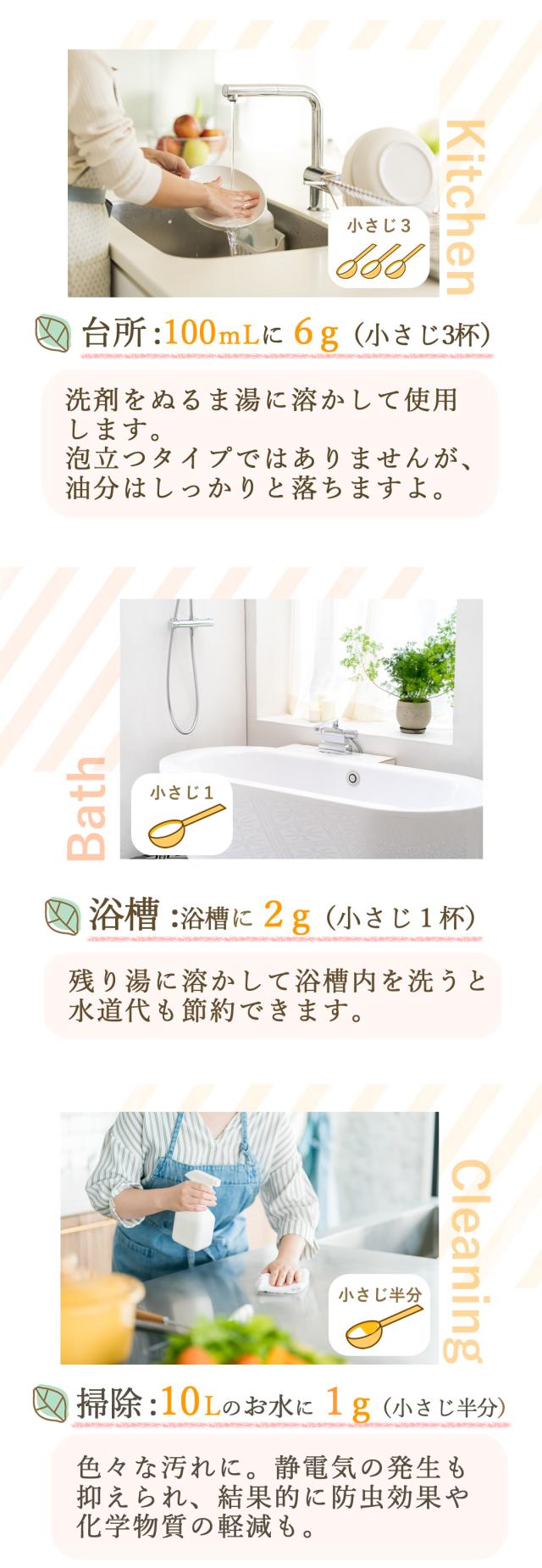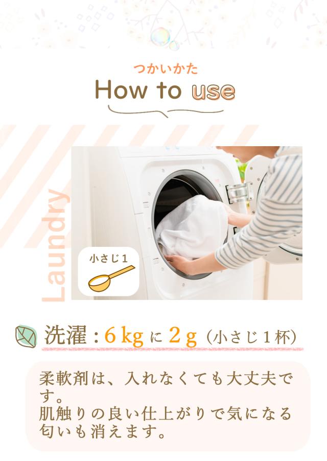★洗濯用…化学物質をまったく使用していません。しかも1回の洗濯で使用する目安は、小さじ1杯!