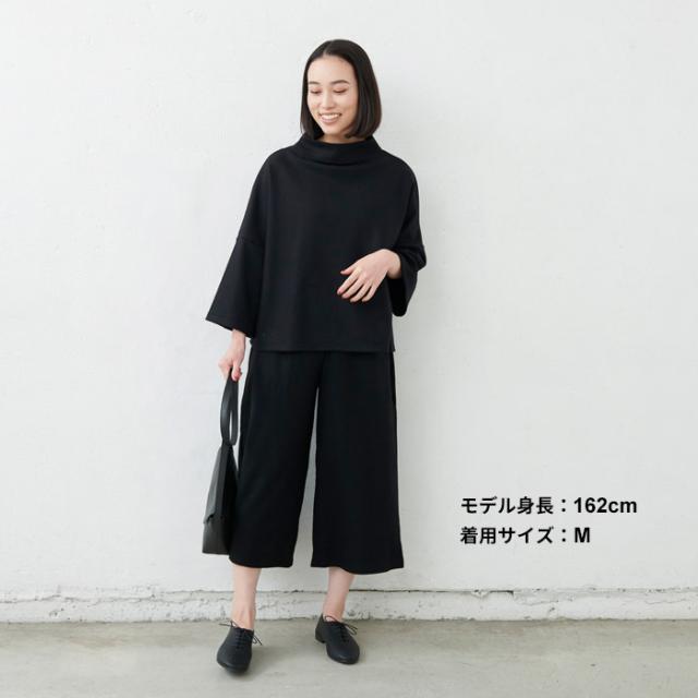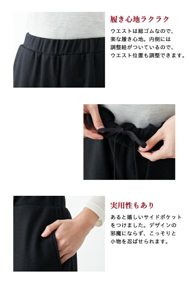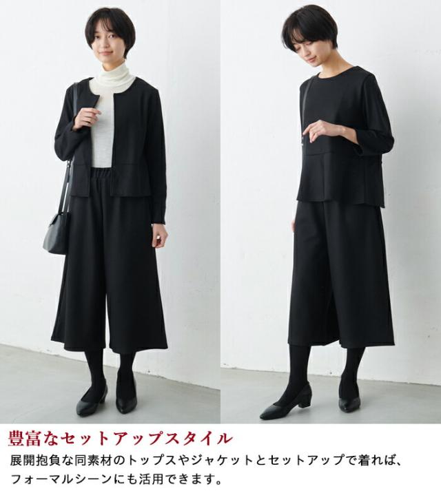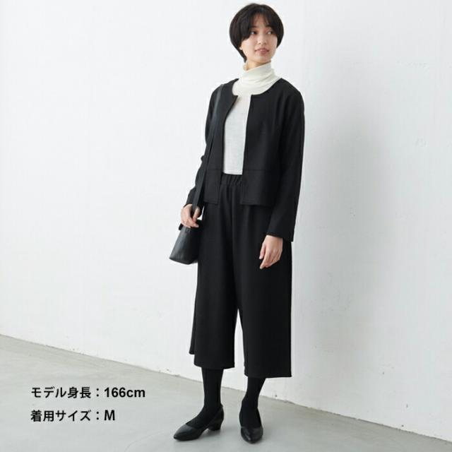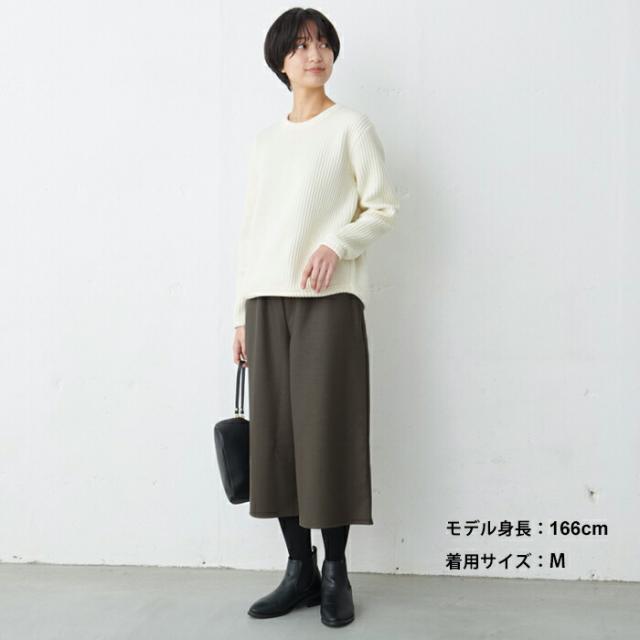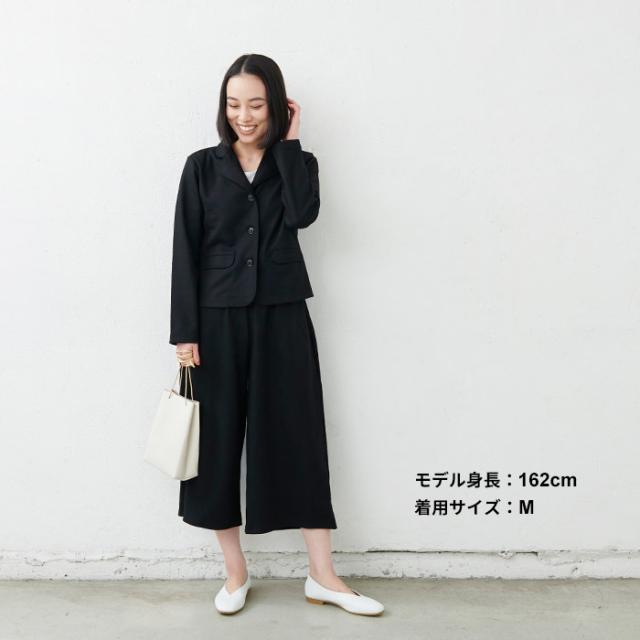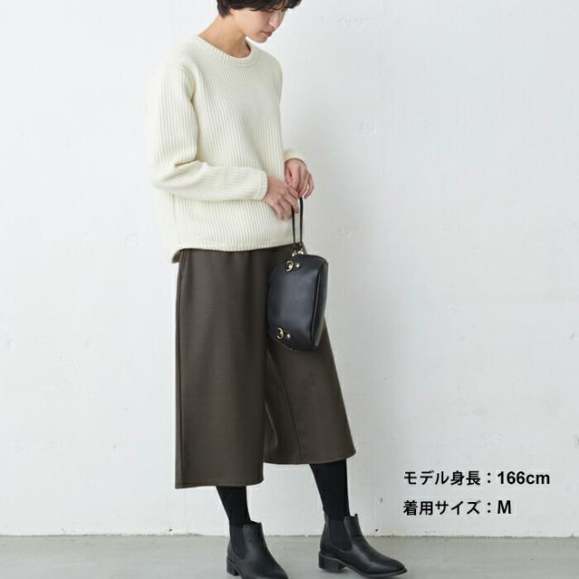 特徴 着まわし自在な冬ガウチョ。ほっこりリラックスしたい日も、カチっときめたい日も、華やかに装いたい日も、万能に活躍してくれるシンプルガウチョパンツ。ほどよい光沢があり、なめらかな質感の圧縮ウールだから、上品な装いに仕上がります。伸縮性のある素材で、ウエストもゴムでラクラク、一枚でも暖かなので、リラックスしたい日のカジュアルコーデにも。着回し力のある万能ガウチョができました。