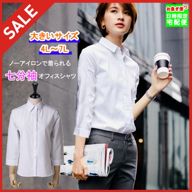 【受取日時指定OK】レディース 大きいサイズ 4L 5L 6L 7L シャツ ブラウス ビジネス オフィス Yシャツ フォーマル スーツ リクルート 就活 OL 事務服 無地 七分袖 7分袖 定番 ホワイト 白 在宅 リモートワーク