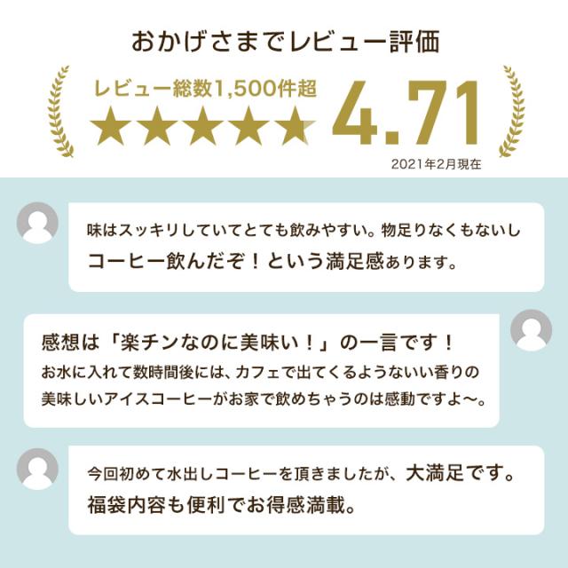 | こんな方にオススメです | 手軽にコーヒーを楽しみたい方:水出し珈琲をボトルにパックを入れてお水を注ぐだけで作ることができます。 カフェインレスコーヒーを楽しみたい方:夜でも安心して飲めるカフェインレスコーヒーが含まれているので、健康を気にする方や、夜にリラックスしたい方におすすめです。 |