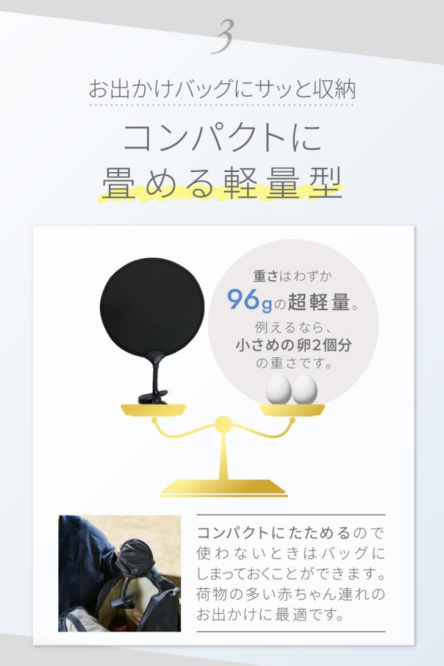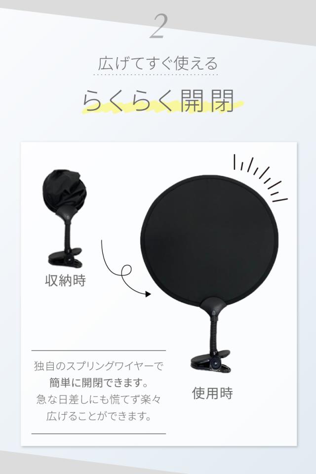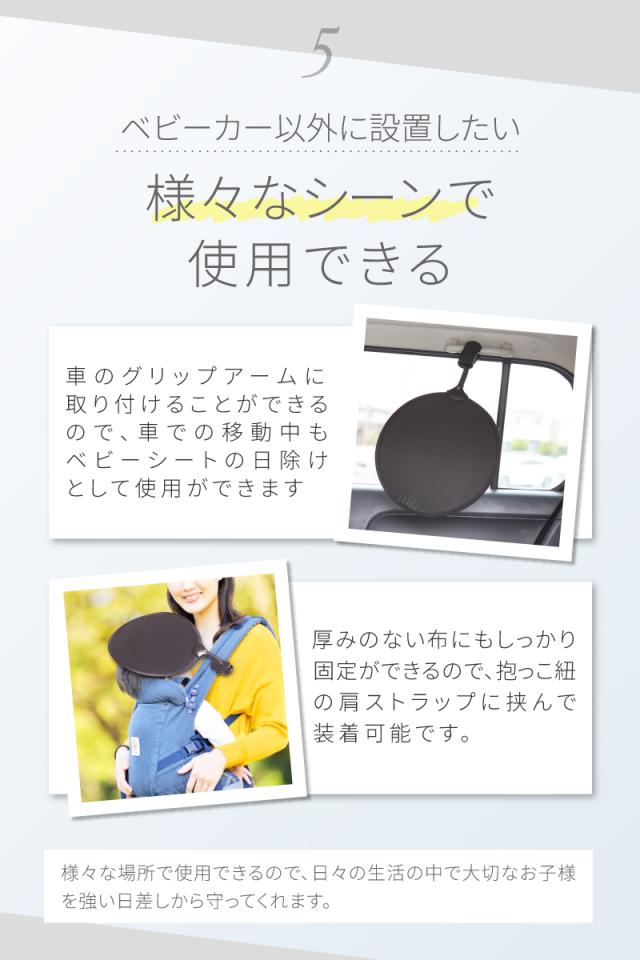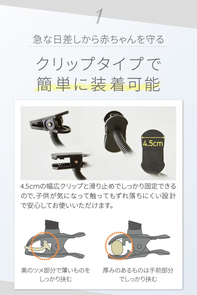 「急な日差しから赤ちゃんも守る クリップタイプで簡単に装着可能」