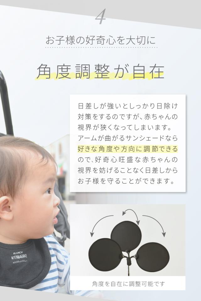 アームが曲がるサンシェードなら好きな角度や方向に調節できるので、好奇心旺盛な赤ちゃんの視界を妨げることなく日差しからお子様を守ることができます。