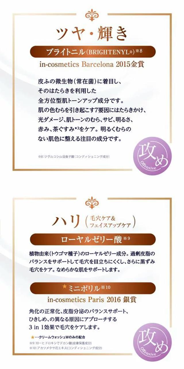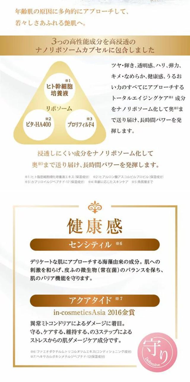 ■なめらかでリッチなテクスチャーはマッサージクリームとしても優れたパフォーマンスを発揮し、ハリのある艶肌へと導きます。 年齢に応じたスキンケア ※2 ヒト脂肪細胞順化培養液エキス(保湿成分)※3 ジグルコシル没食子酸(コンディショニング成分)※4 10‐ヒドロキシデカン酸(皮膚保護成分)※5 オロバンケラプムエキス(コンディショニング成分)※6 ファエオダクチルムトリコルヌツムエキス(コンディショニング成分)