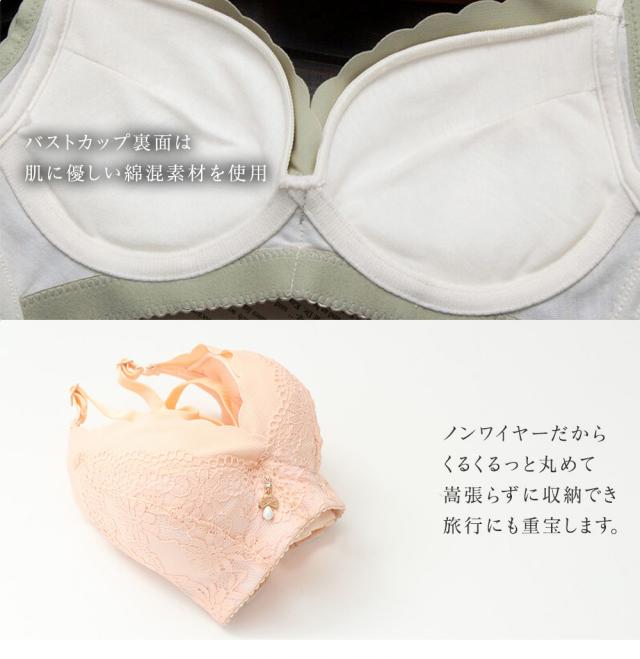 ノンワイヤーで肌に優しく、快適な着け心地!ノンワイヤーでありながらもバストを中央に寄せる設計が施され、女性らしい谷間を演出。バストカップ裏面は肌に優しい綿混素材を使用しています。