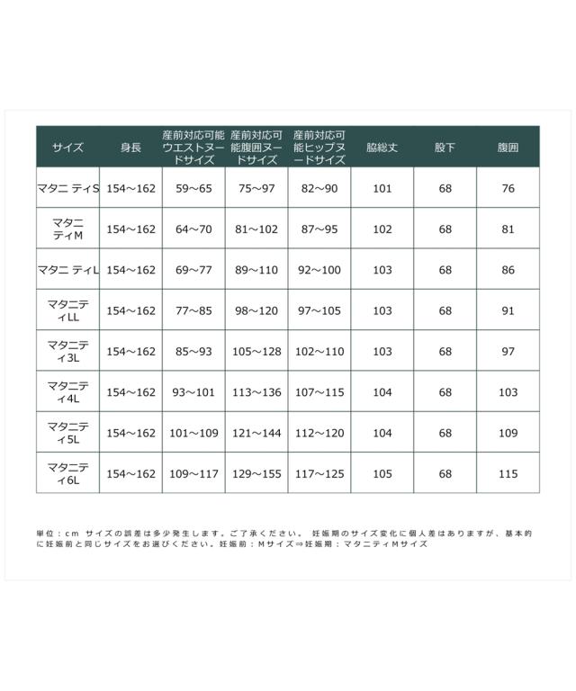 品質=身生地:綿95%・ポリウレタン5%(カットソー) ボタン付ゴム仕様(ウエスト調節可) 原産国:中国製 備考:単位:cm ※サイズの誤差は多少発生します。ご了承ください。 ※妊娠期のサイズ変化に個人差はありますが、基本的に妊娠前と同じサイズをお選びください。 妊娠前:Mサイズ⇒妊娠期:マタニティMサイズ