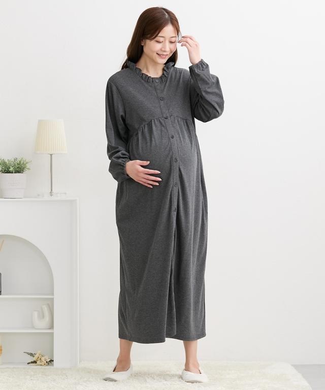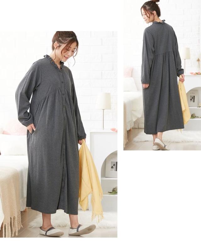 パジャマ マタニティ ママ 産前 産後 授乳服 綿混 スムース ギャザー切替え 前開き ネグリジェ LL/3L