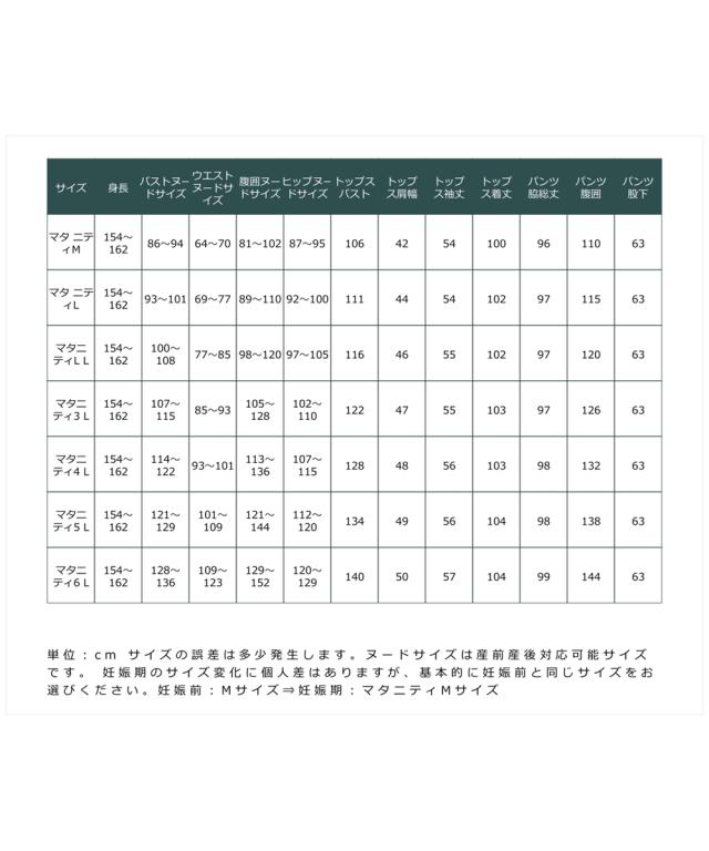品質:ポリエステル65%・綿35%(織物 ビエラ起毛) 透け感:透けない 伸縮性:なし 生地の厚み:普通 開き:前ボタン 裏地:なし ポケット:[ワンピース]あり(前2) [パンツ]なし ウエスト:[パンツ]ボタン付ゴム仕様(調節可) シルエット:ゆったり 柄の出方が多少異なる場合があります。 原産国:中国製 備考:単位:cm ※サイズの誤差は多少発生します。ご了承ください。 ※妊娠期のサイズ変化に個人差はありますが、基本的に妊娠前と同じサイズをお選びください。 妊娠前:Mサイズ⇒妊娠期:マタニティMサイズ
