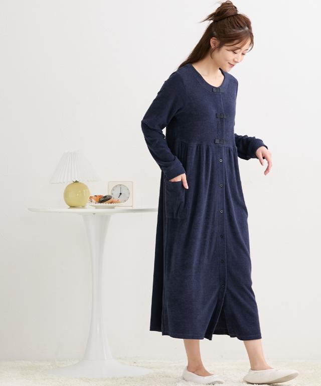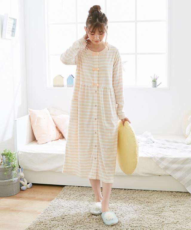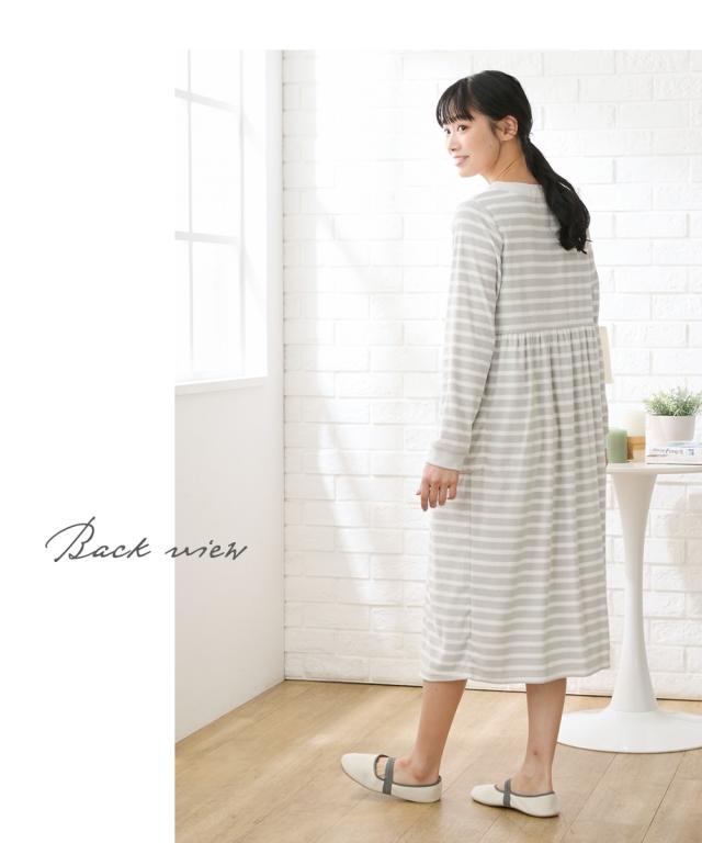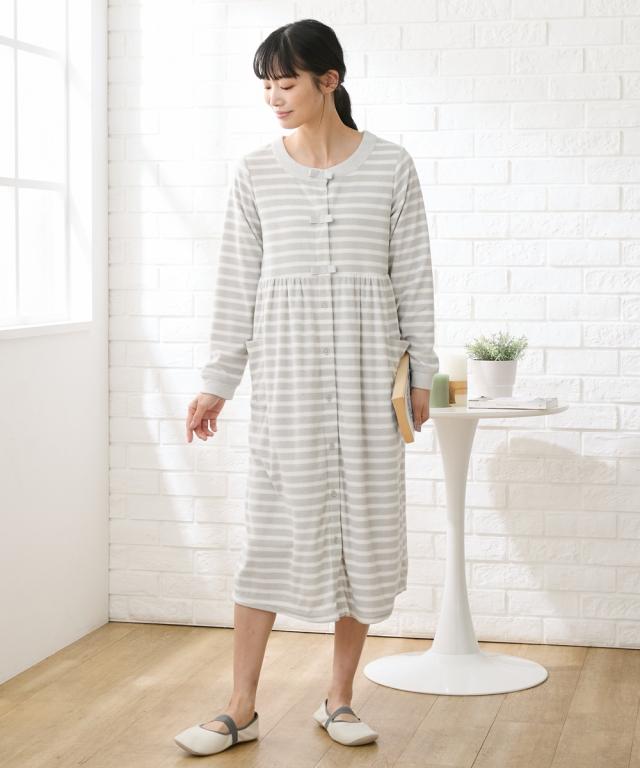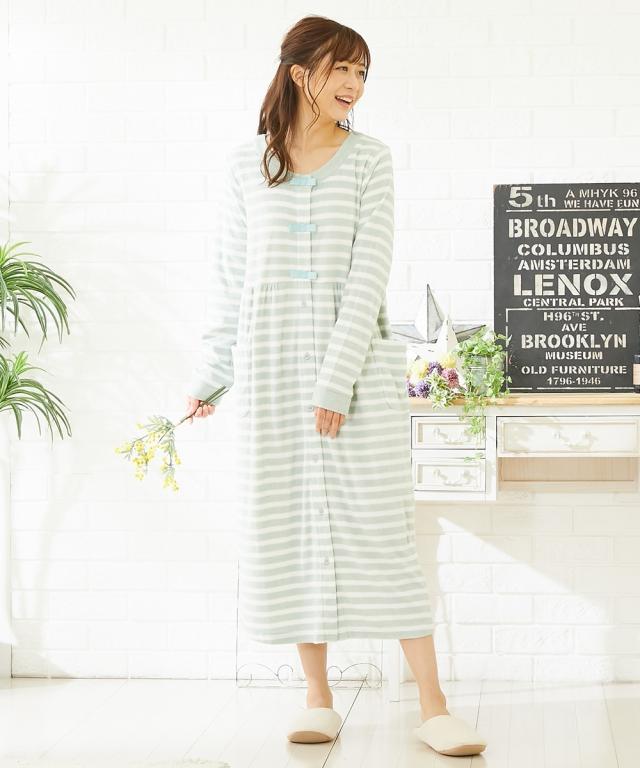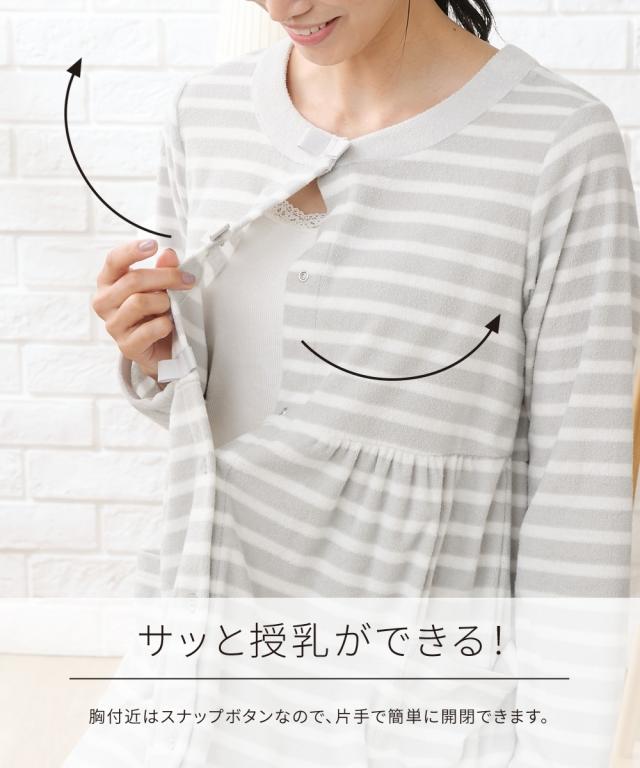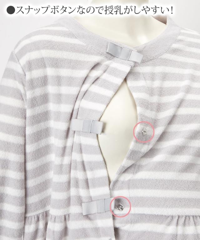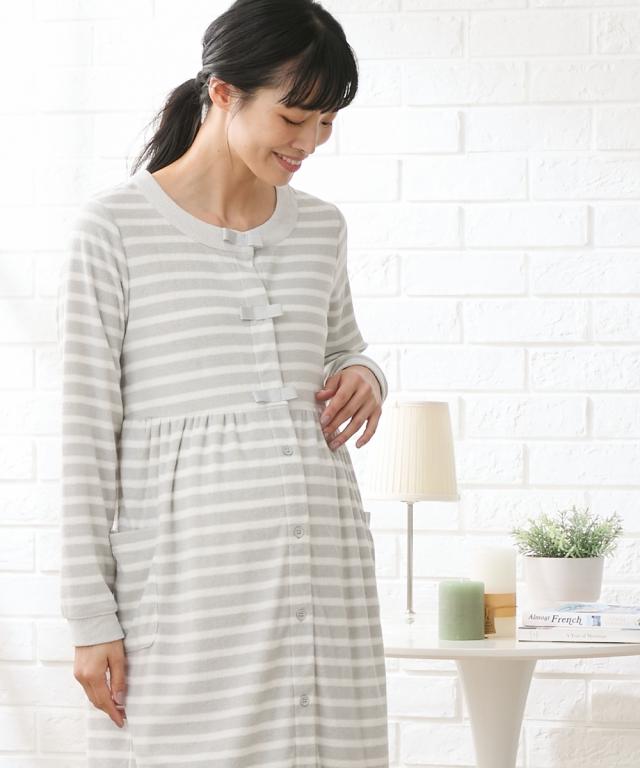 【産前・産後 授乳服】綿混パイル 前開きマタニティボーダーリボン付ネグリジェ