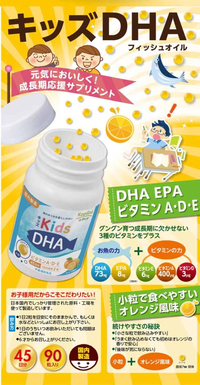 キッズDHA ビタミンA・D・E配合 [ボトルタイプ] 90粒 1個45日分【小粒ソフトカプセル/オレンジ風味/子育て応援/DHA&EPA配合/ビタミン/子供/健康/サプリ/サプリメント/栄養補助食品/安心国内製造/コプリナ/送料無料】