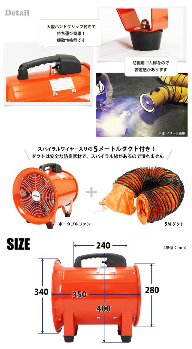 狭い場所や換気しにくい場所の循環と送風、排風に最適! ●マンホール/タンクの送風/排風に、橋梁、大型容器等の溶接ヒュームの排気に 大型ハンドグリップ付きで持ち運び簡単な上、機動性抜群 ●機械等の部分冷却にもご使用頂けます ●ダクトを折曲げてもスパイラル線があるので潰れません ●ダクトを外した状態で使用すると音が大きくなります ●専用フレキシブルダクト5メートル1本付き ☆別売りで延長用ダクト5メートルも販売しております 別サイズのものも販売しております ★ポータブルファン200mm 5mダクト付き(SET-PF-200) ★ポータブルファン300mm 5mダクト付き(SET-PF-300) ★ポータブルファン400mm 5mダクト付き(SET-PF-400) 品番:SET-PF-250 |
